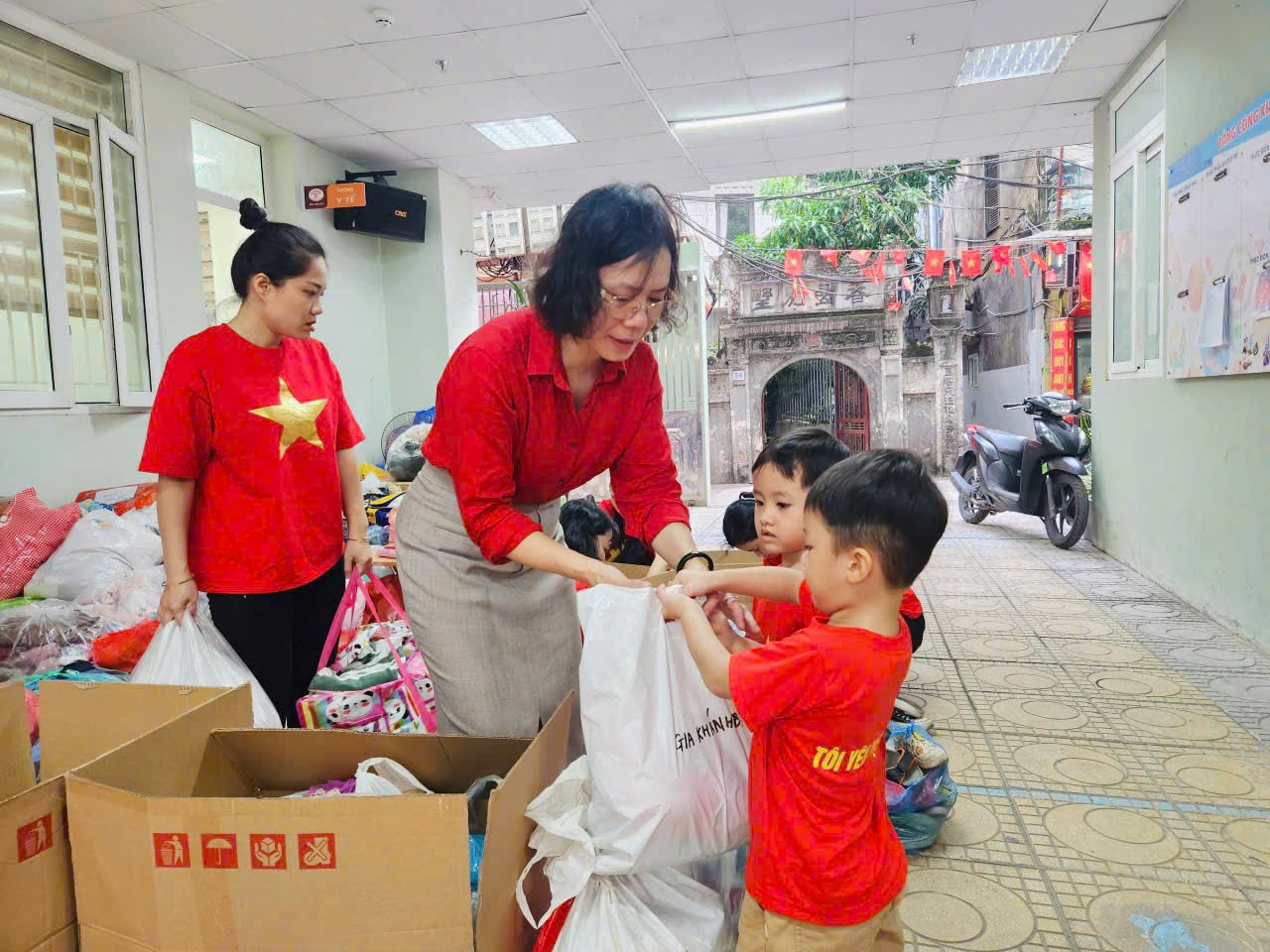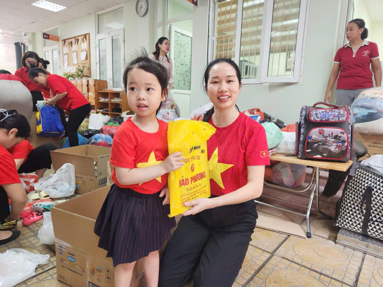 Những đồ dùng đã được các cô giáo phân loại, đóng gói gọn gàng, cẩn thận để gửi tới đồng bào lũ lụt.