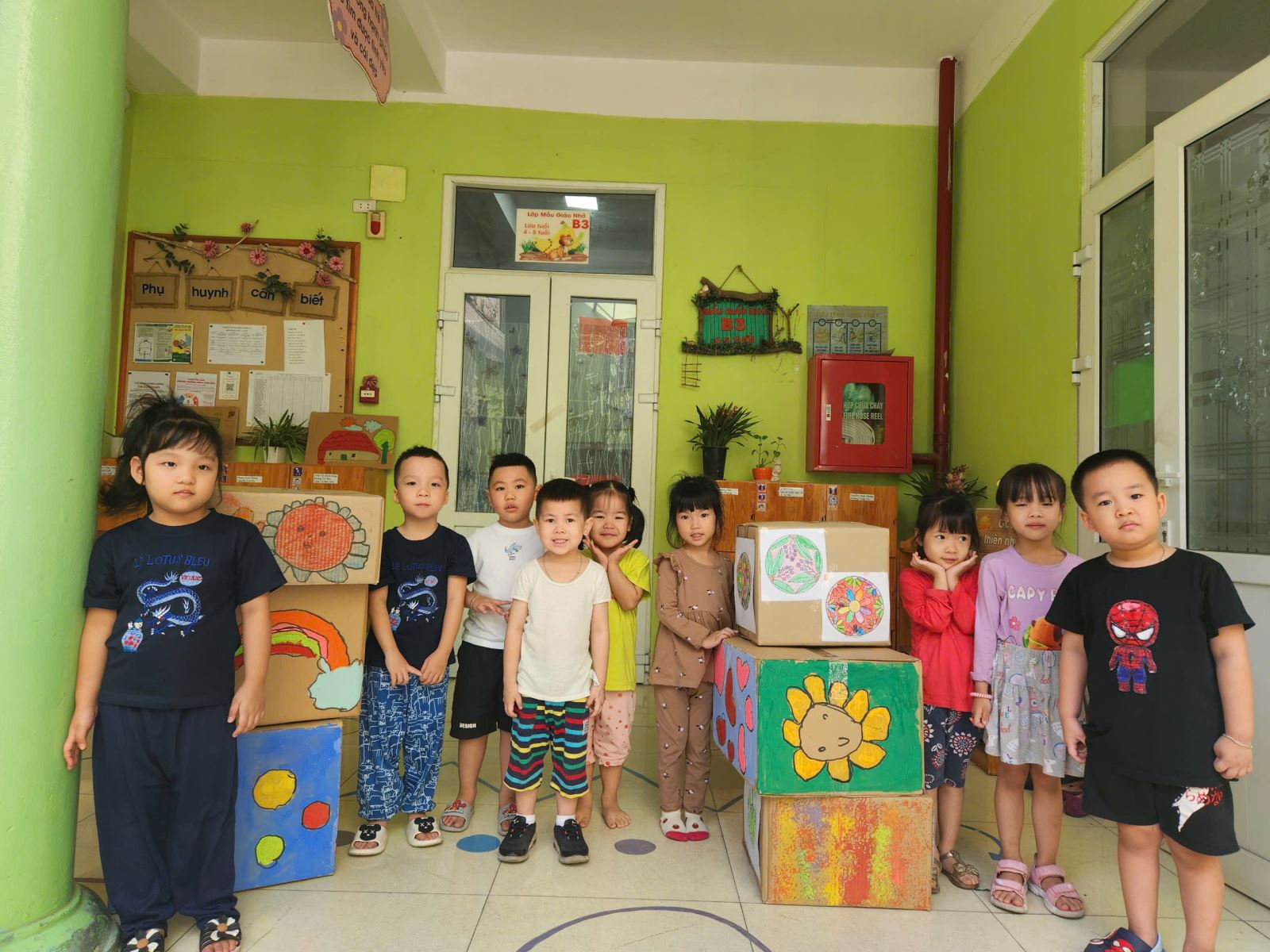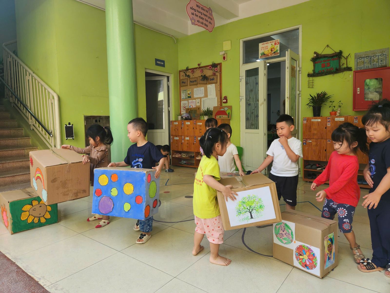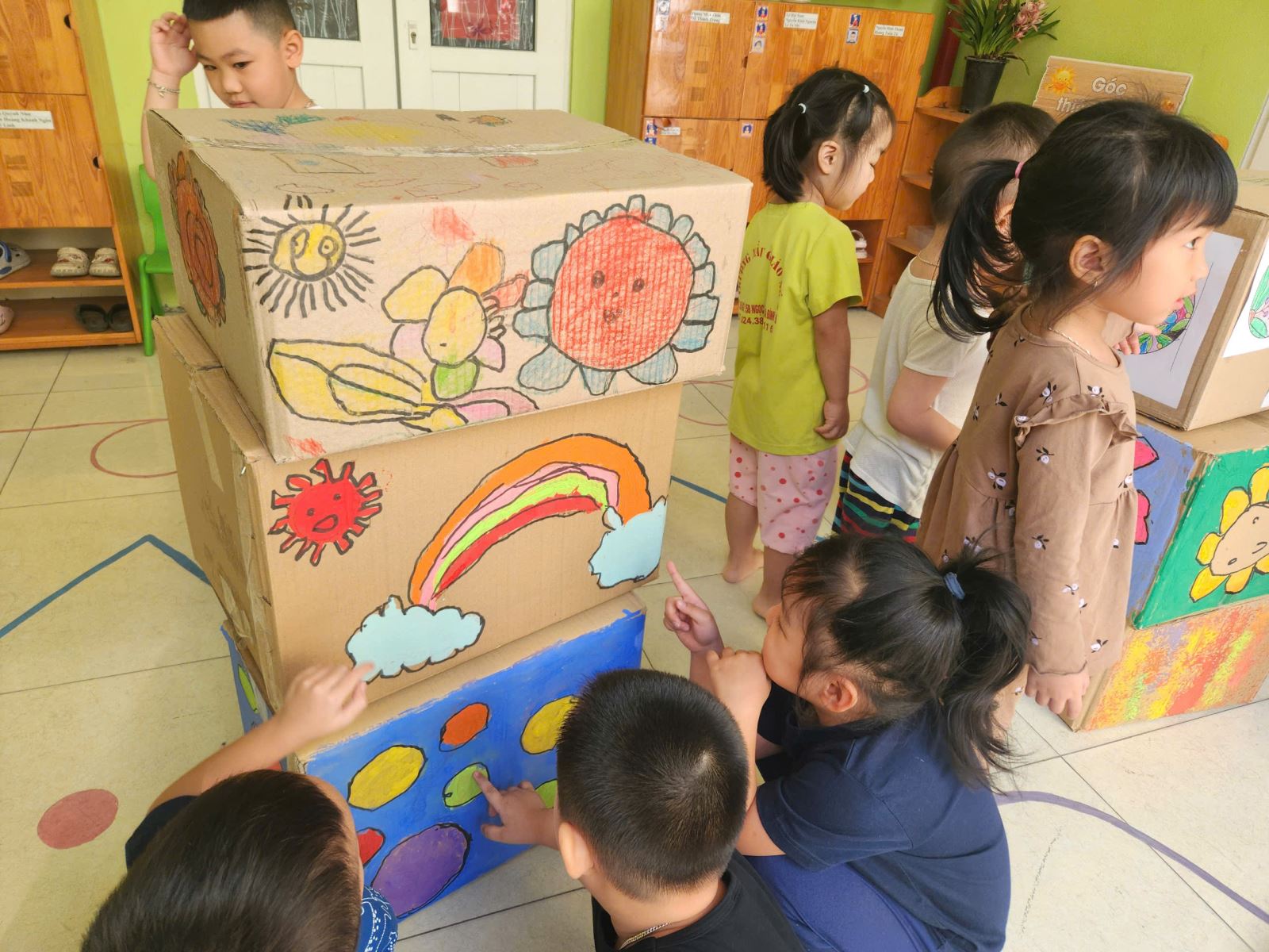 Các cô giáo đã chuẩn bị những chiếc thùng bìa carton lớn, cung cấp cho các bé các loại bút màu và dụng cụ vẽ. Các bé hào hứng bắt tay vào việc trang trí thùng carton với đủ loại hình vẽ từ những bông hoa rực rỡ, cây cối xanh mướt đến những nhân vật hoạt hình ngộ nghĩnh.
