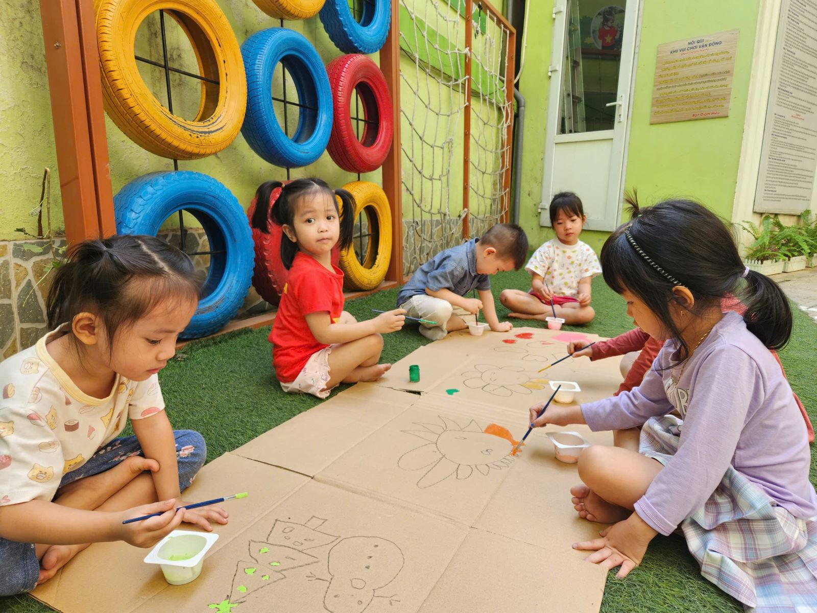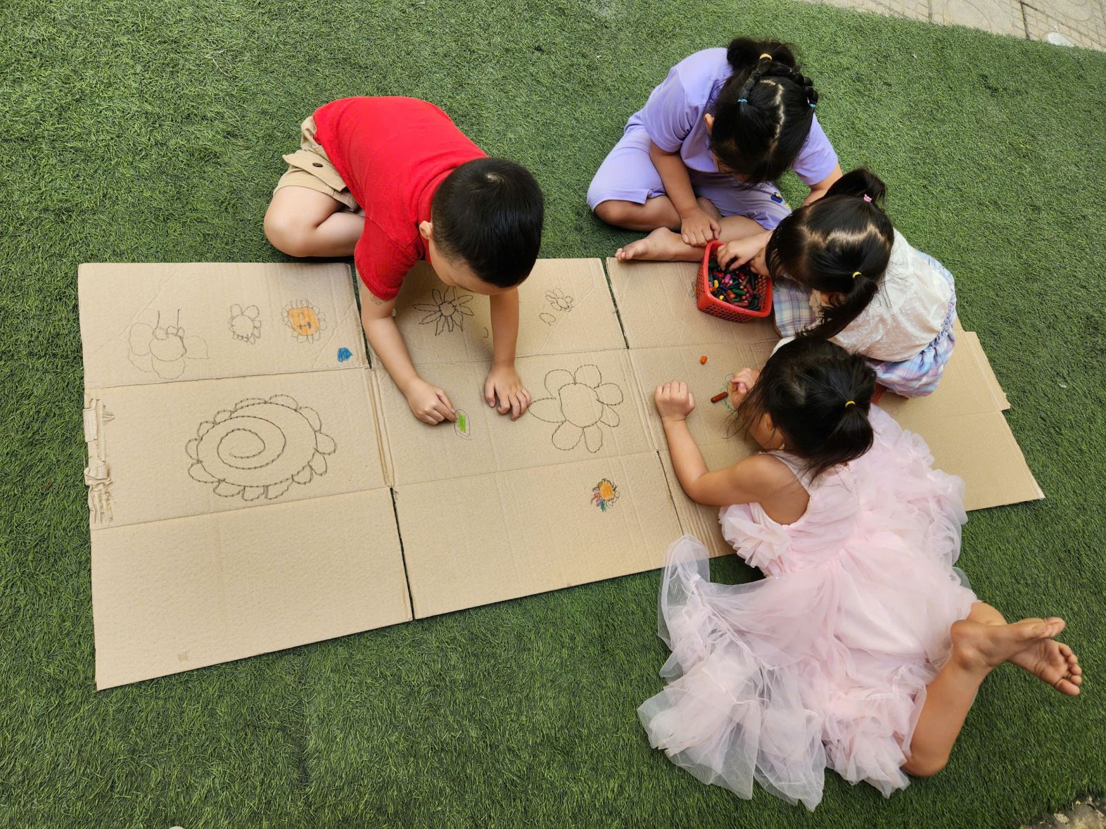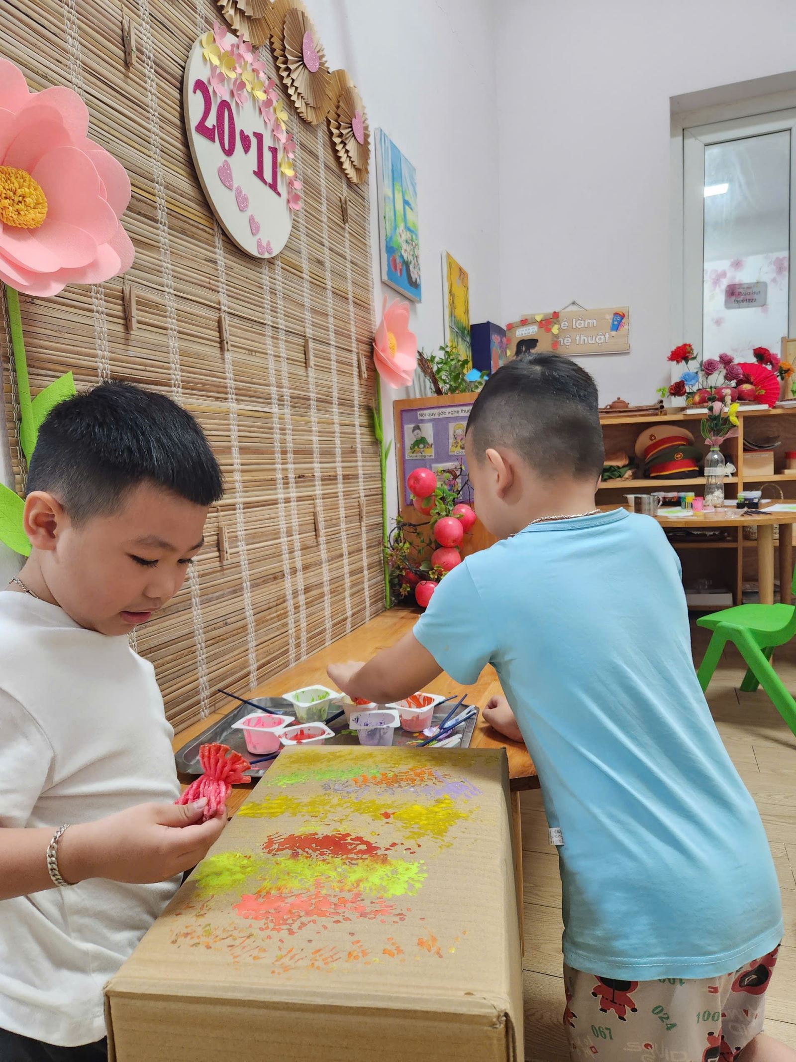 Các cô giáo đã chuẩn bị những chiếc thùng bìa carton lớn, cung cấp cho các bé các loại bút màu và dụng cụ vẽ. Các bé hào hứng bắt tay vào việc trang trí thùng carton với đủ loại hình vẽ từ những bông hoa rực rỡ, cây cối xanh mướt đến những nhân vật hoạt hình ngộ nghĩnh.