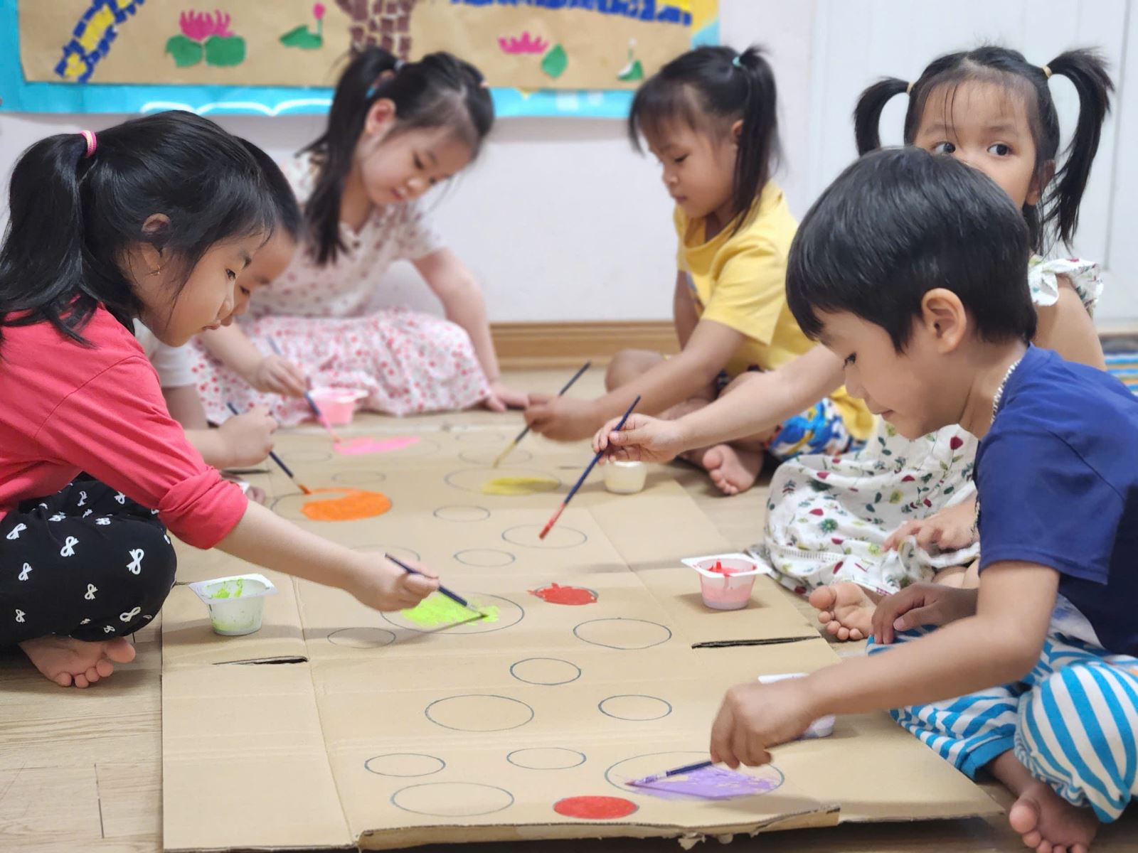 Hoạt động không chỉ giúp các bé rèn luyện kỹ năng vẽ, phát triển tư duy sáng tạo mà còn khuyến khích tinh thần đồng đội và khả năng làm việc nhóm. Các bé cùng nhau thảo luận, chia sẻ ý tưởng và hỗ trợ lẫn nhau trong quá trình vẽ.