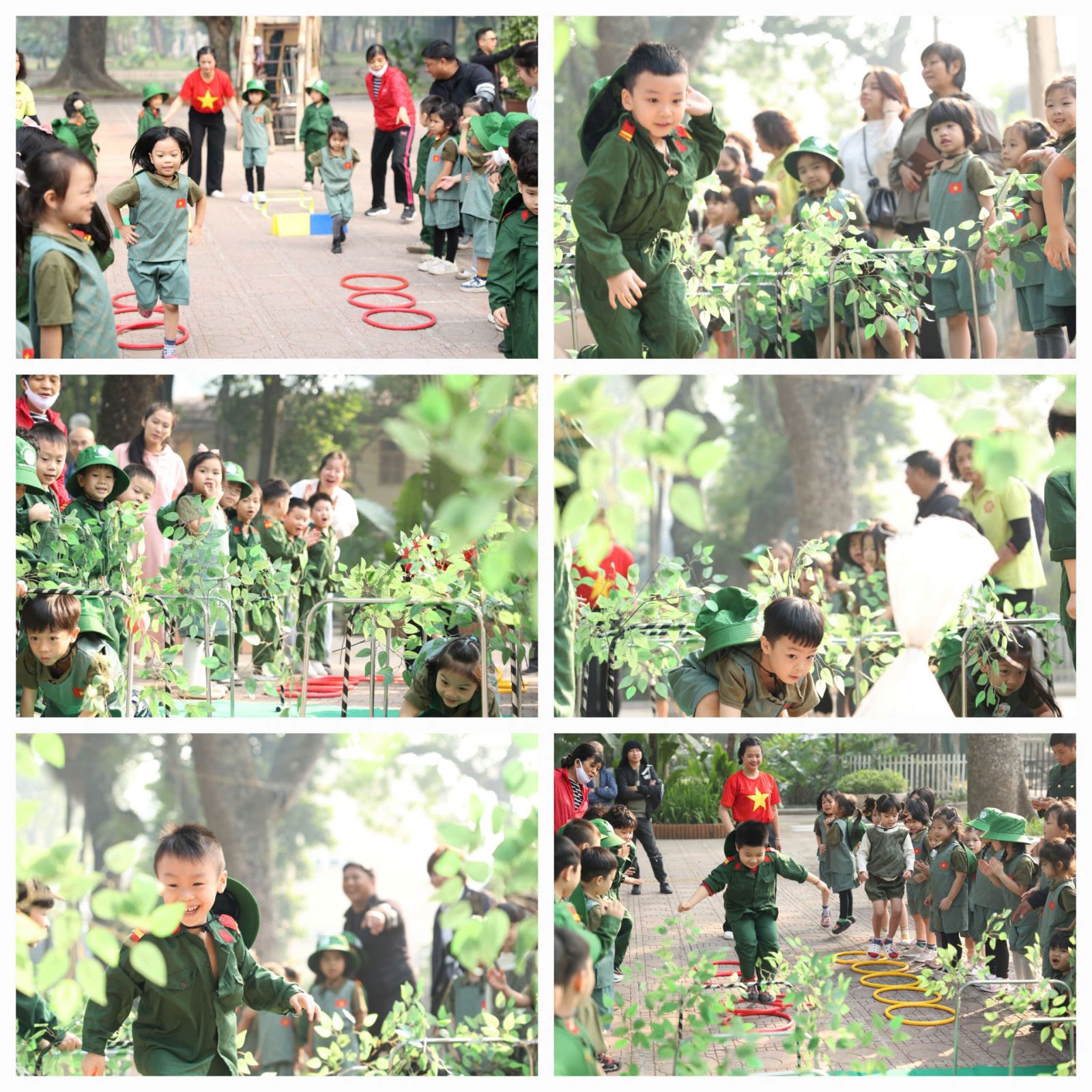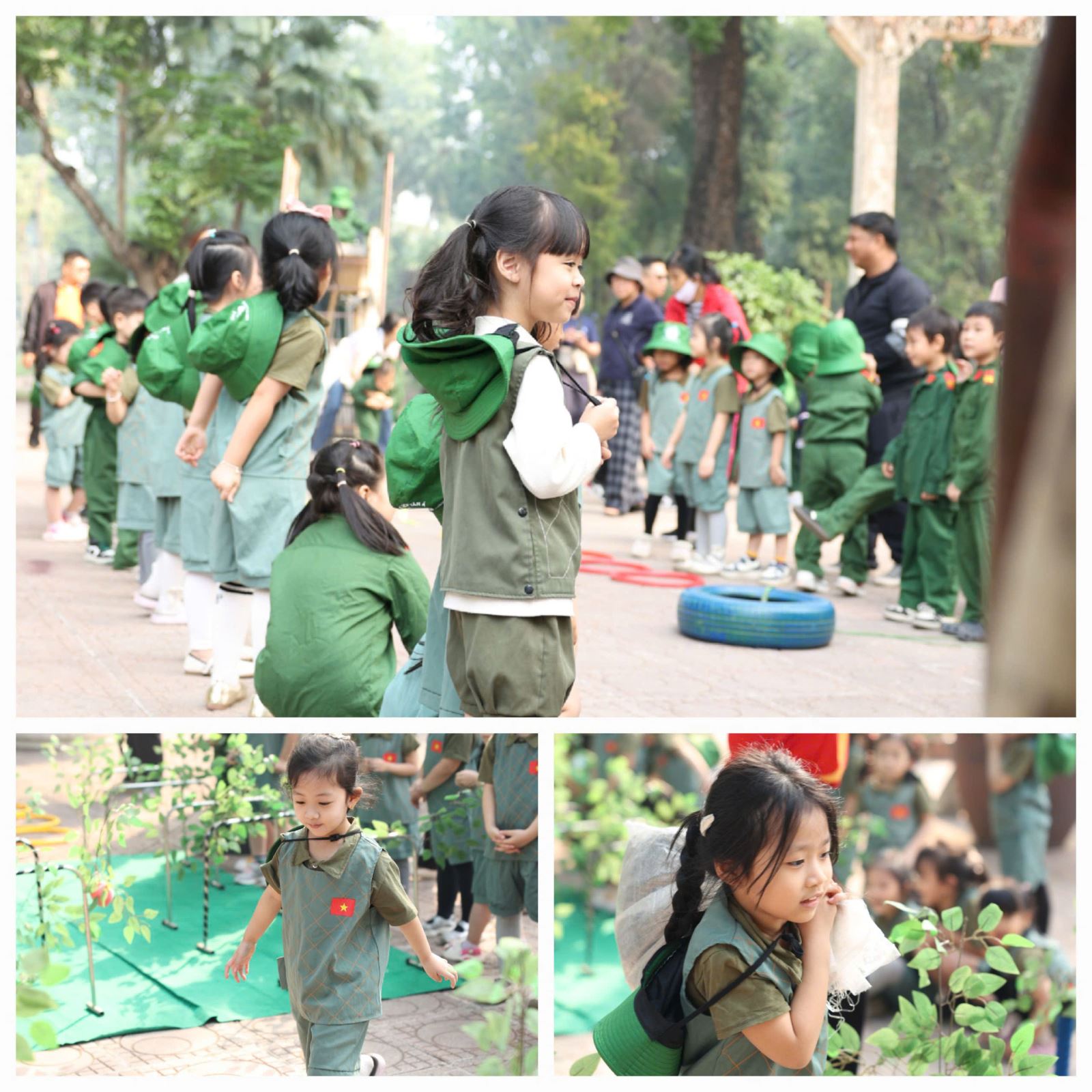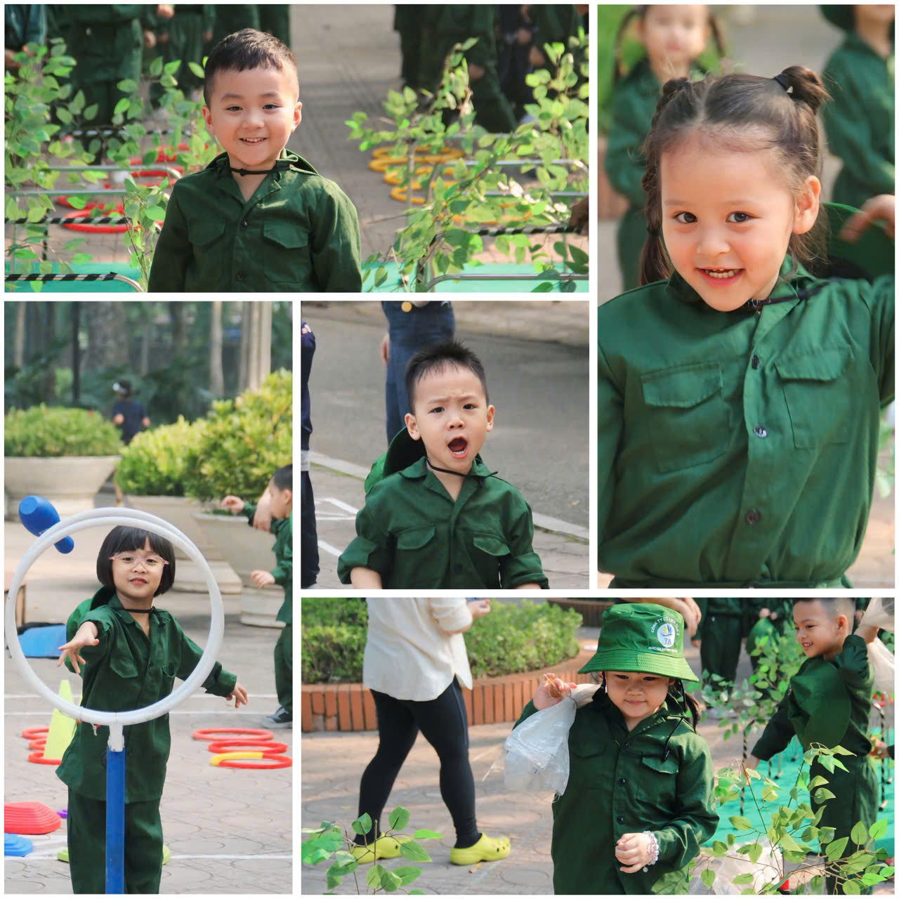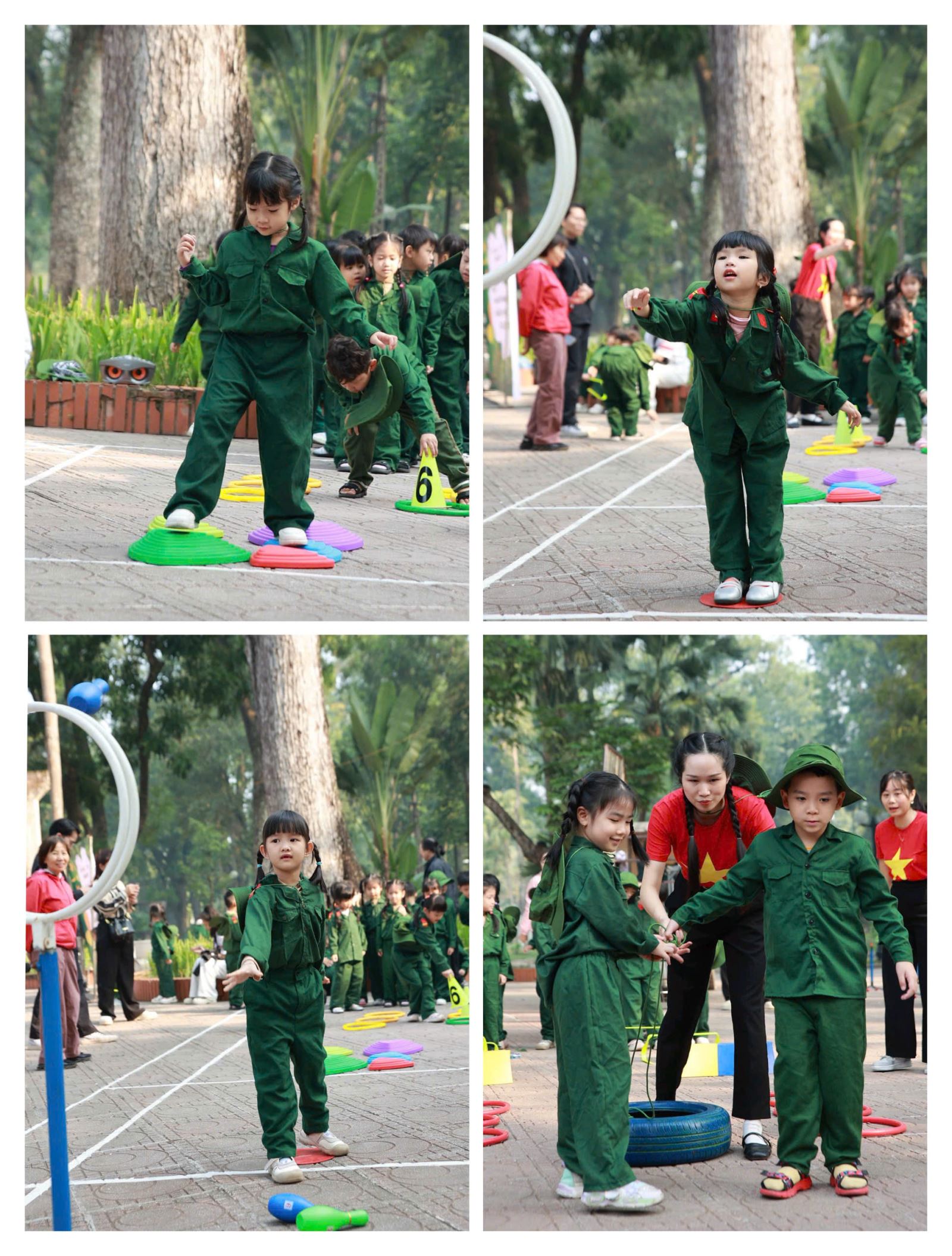 Sau đó, tinh thần đồng đội được đẩy lên cao qua các thử thách tại "thao trường" sinh động. Các bé đã thể hiện sự khéo léo và nhanh nhẹn qua các thao trường như "Ném lự đạn" và "Kéo pháo". Thử thách "Vác tải gạo qua rừng" đòi hỏi sự bền bỉ, giúp các con học được tinh thần vượt khó như những người lính thực thụ.