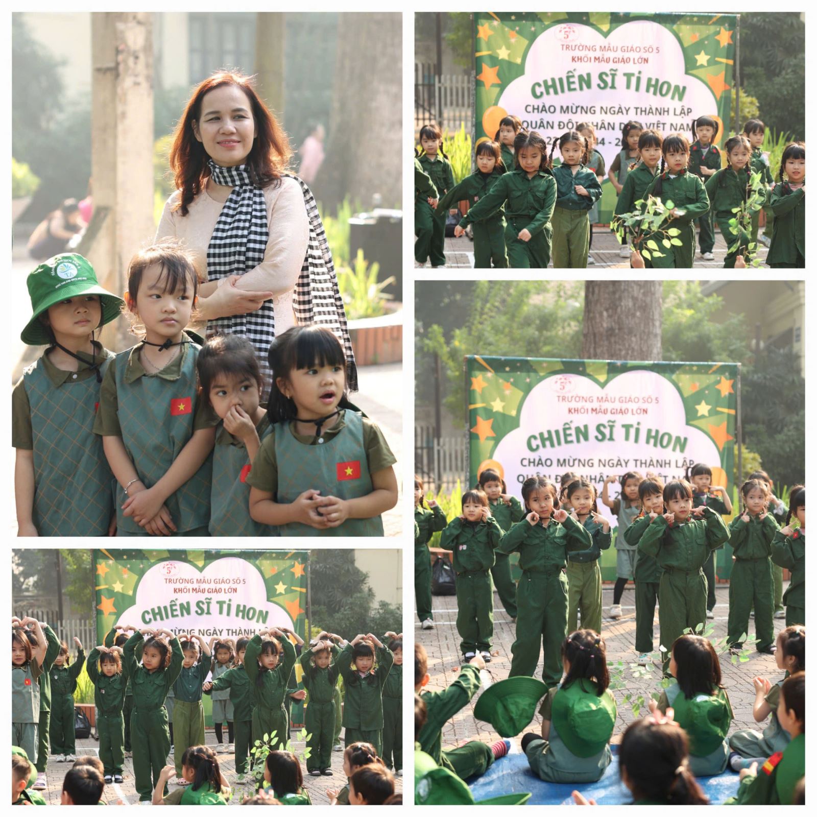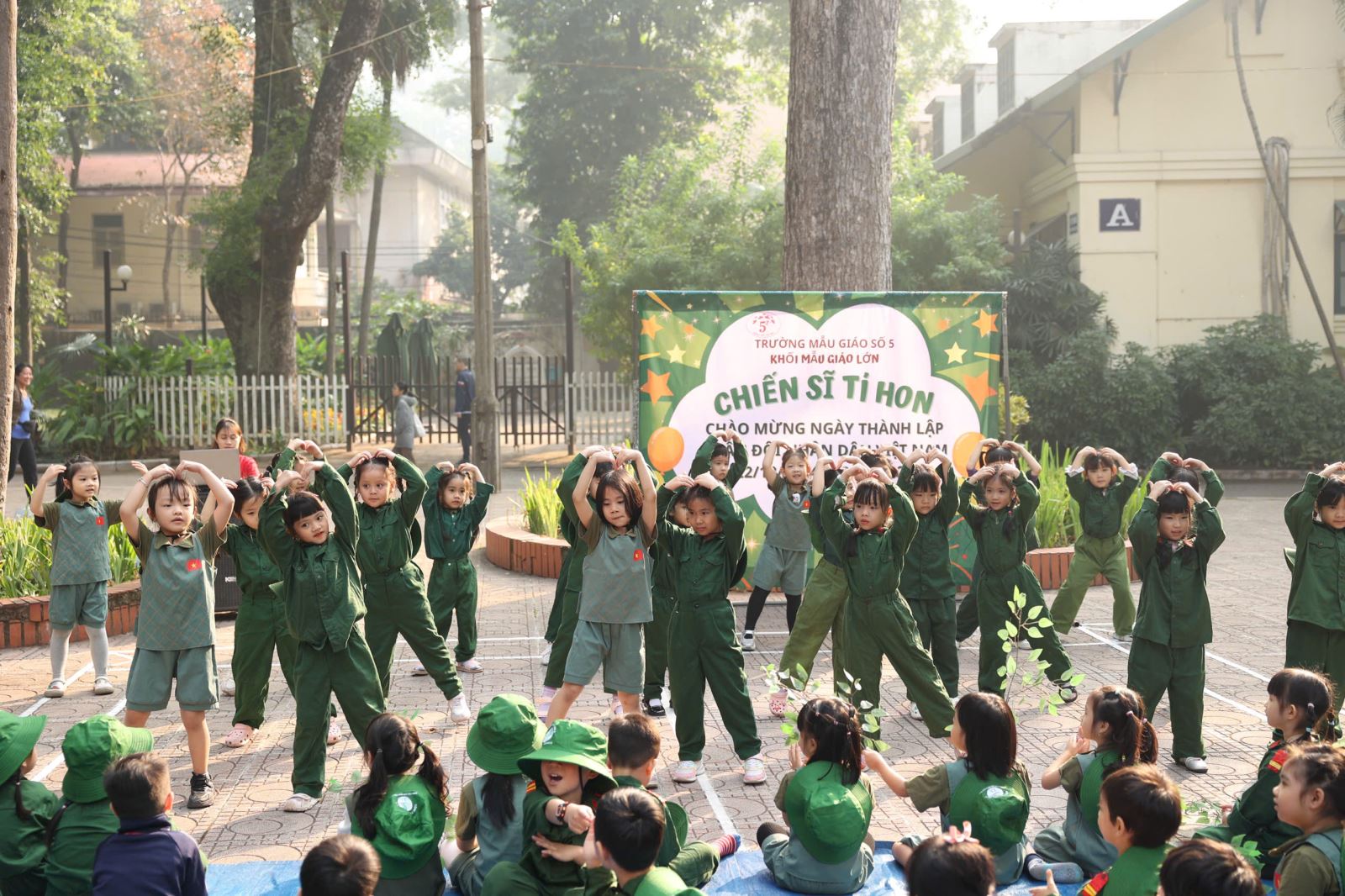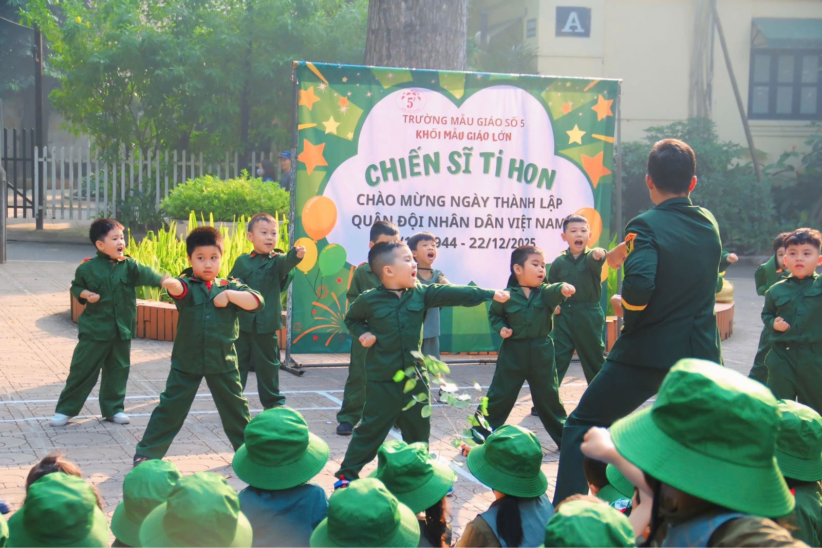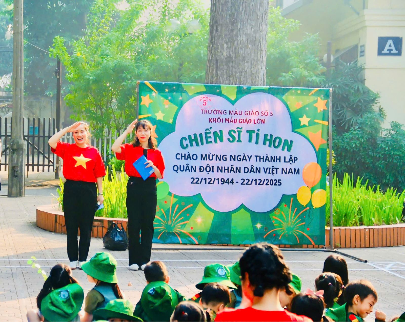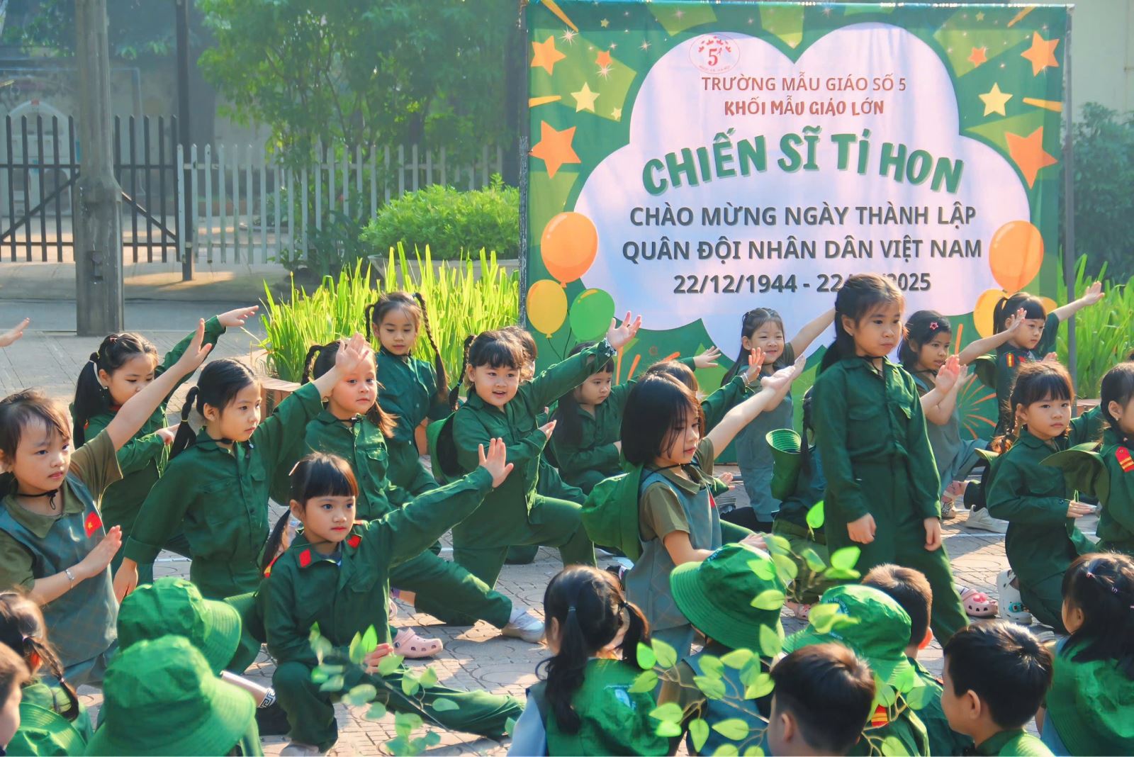 Sáng ngày 10/12/2025, Trường Mẫu giáo Số 5 đã tổ chức thành công chương trình Giao lưu "Chiến sĩ tí hon" đầy ý nghĩa dành cho các con khối mẫu giáo lớn (A1, A2, A3) nhằm chào mừng 81 năm Ngày thành lập Quân đội Nhân dân Việt Nam (22/12/1944 - 22/12/2025). Hoạt động đã diễn ra sôi nổi, để lại nhiều ấn tượng sâu sắc trong lòng các chiến sĩ nhí và toàn thể khách mời.