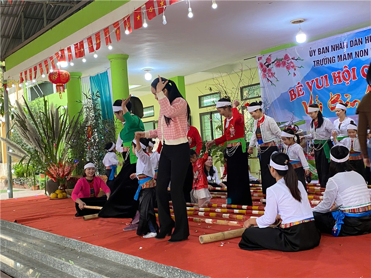 Giáo viên trường MG Số 5 múa sạp cùng cô và trẻ của trường MN Ba Trại A