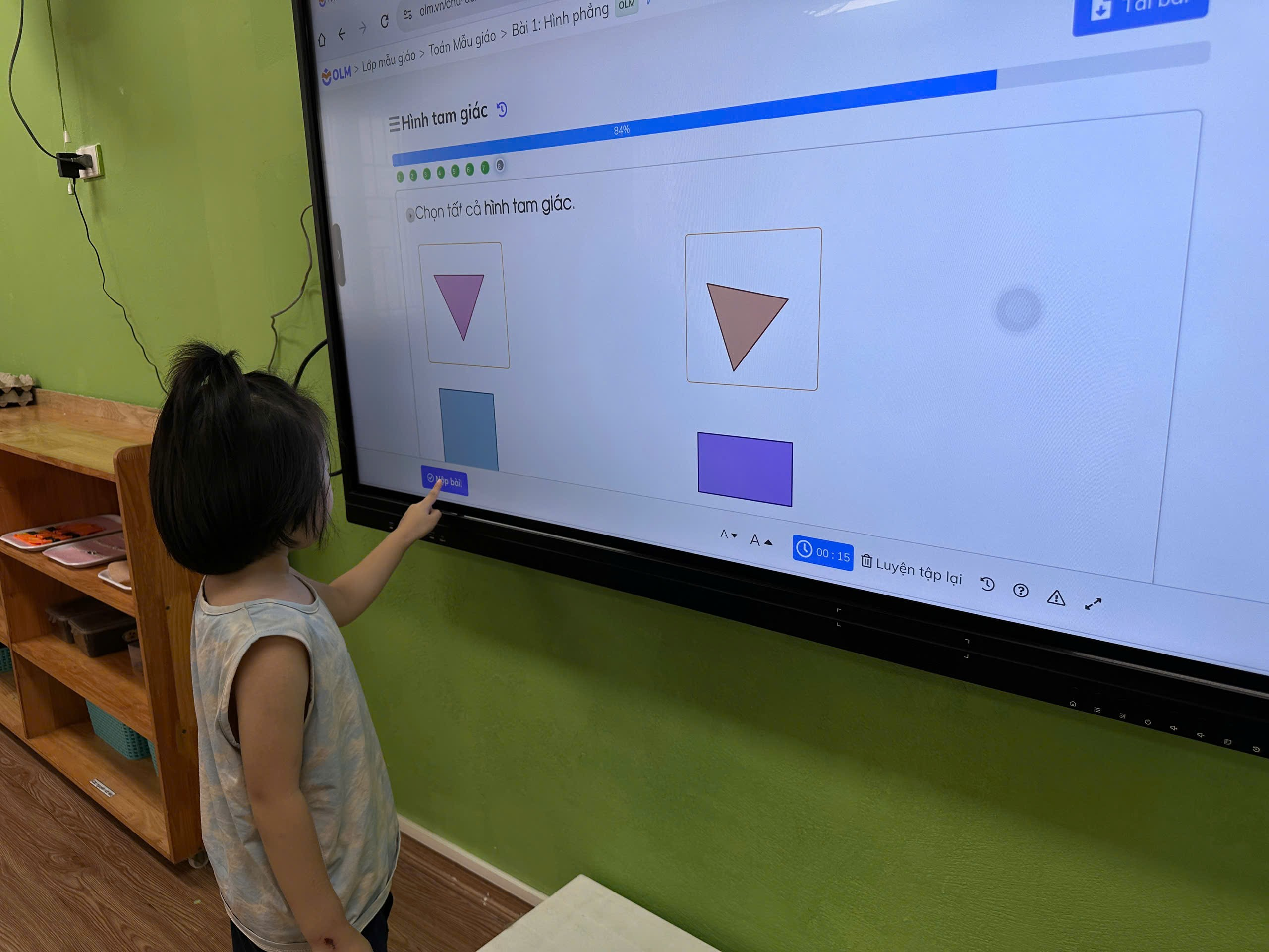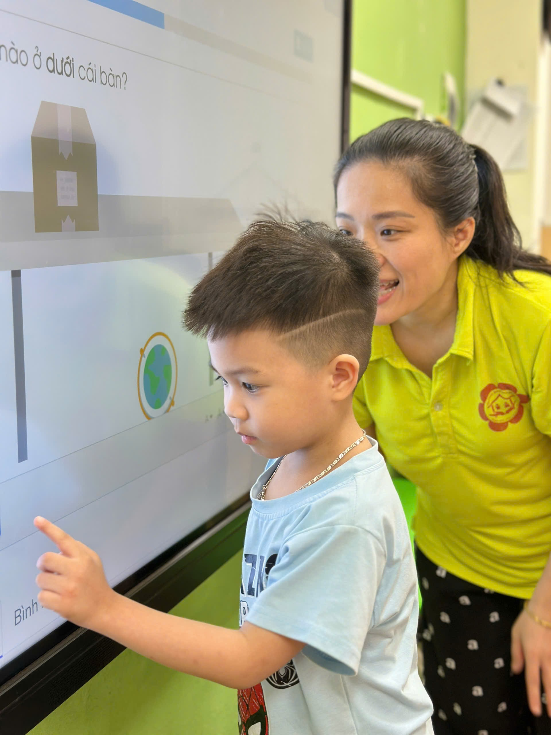 Trẻ không chỉ được tiếp cận với những bài giảng điện tử, mà còn được hướng dẫn tương tác với màn hình thông minh với những trò chơi học tập được thiết kế trên những phần mềm công nghệ. Trẻ được trải nghiệm, thực hành, thể hiện ý tưởng sáng tạo của mình qua màn hình tương tác.