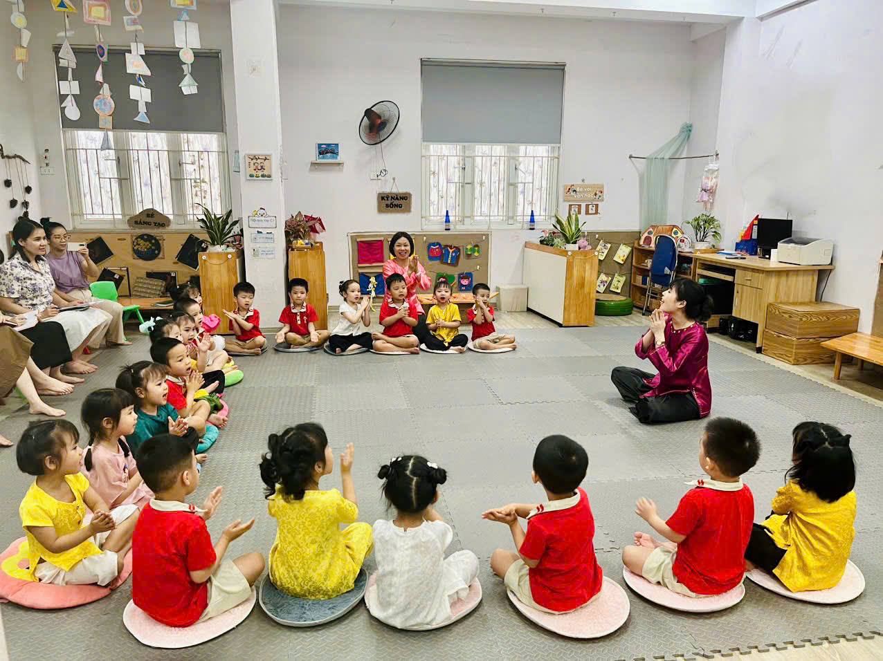 Tại buổi kiến tập các cô giáo được tham dự các hoạt động thuộc lĩnh vực phát triển ngôn ngữ cho trẻ của các khối lớp. Cụ thể: Hoạt động “Dạy trẻ làm thơ” của lớp Mẫu giáo lớn A1 do cô giáo Thiên Hương và Trần Trang thực hiện. Hoạt động “Phát triển vốn từ cho trẻ” của lớp Mẫu giáo nhỡ B2 do cô Trương Mơ và cô Đặng Ngần thực hiện. Hoạt động “Dạy trẻ đọc diễn cảm Đồng dao” của lớp Mẫu giáo bé C2, do cô Ngô Thùy và cô Hồng Tuyên thực hiện.