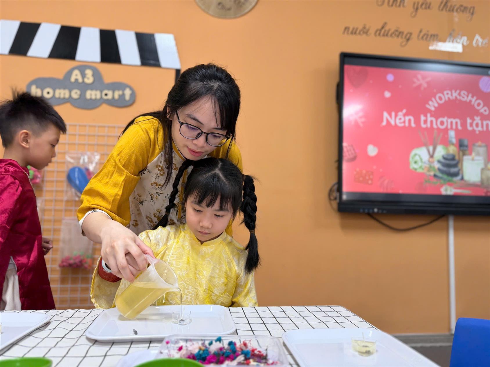 Người ta thường nói: "Thấy áo dài là thấy Tết". Với các bé lớp Mẫu giáo nhỡ, Tết năm nay thật đặc biệt khi các con được tự mình trải nghiệm diện lên bộ áo dài truyền thống của dân tộc.