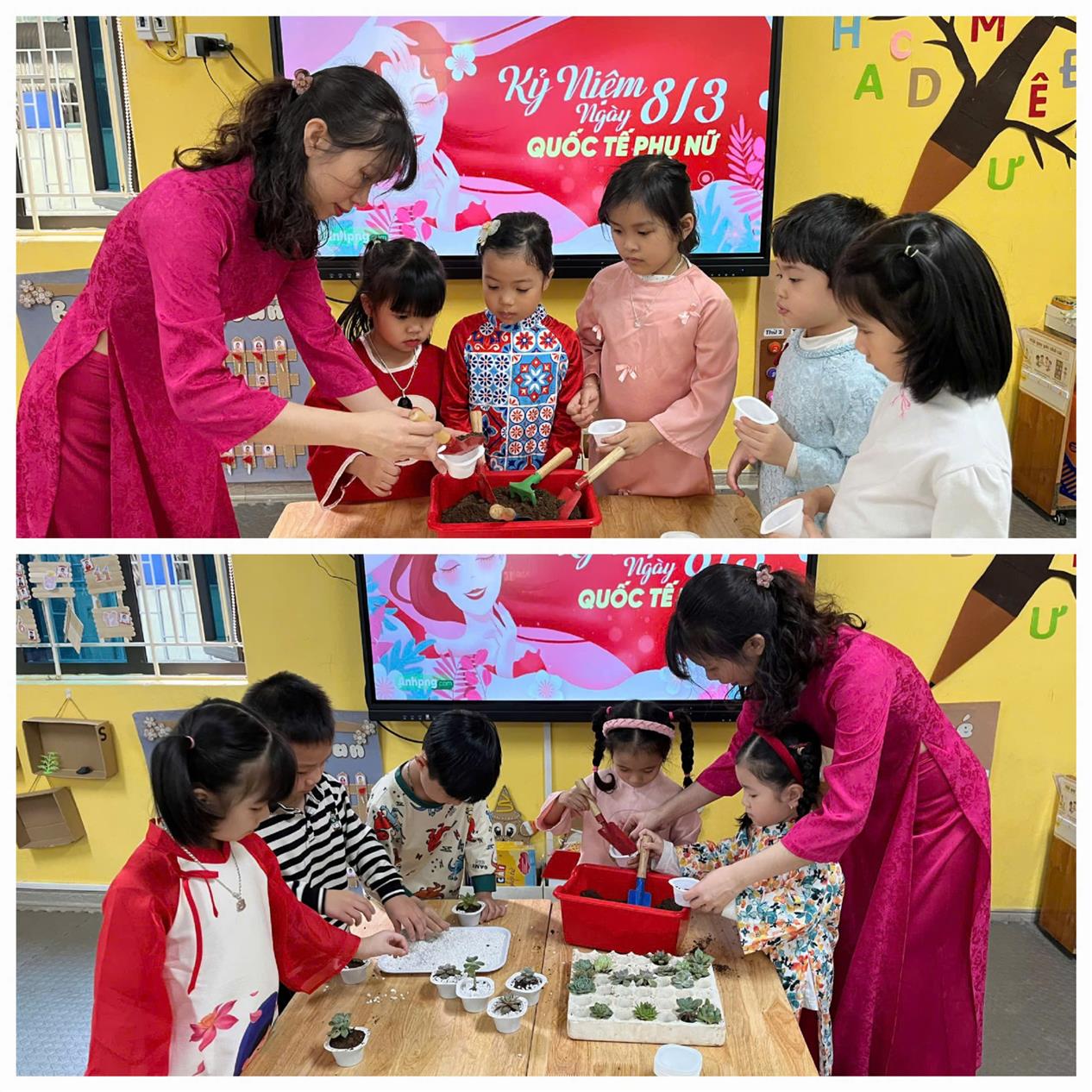 Áo dài khoe sắc thắm, bé đón tết xum vầy của Các bé lớp Nhà trẻ D1.