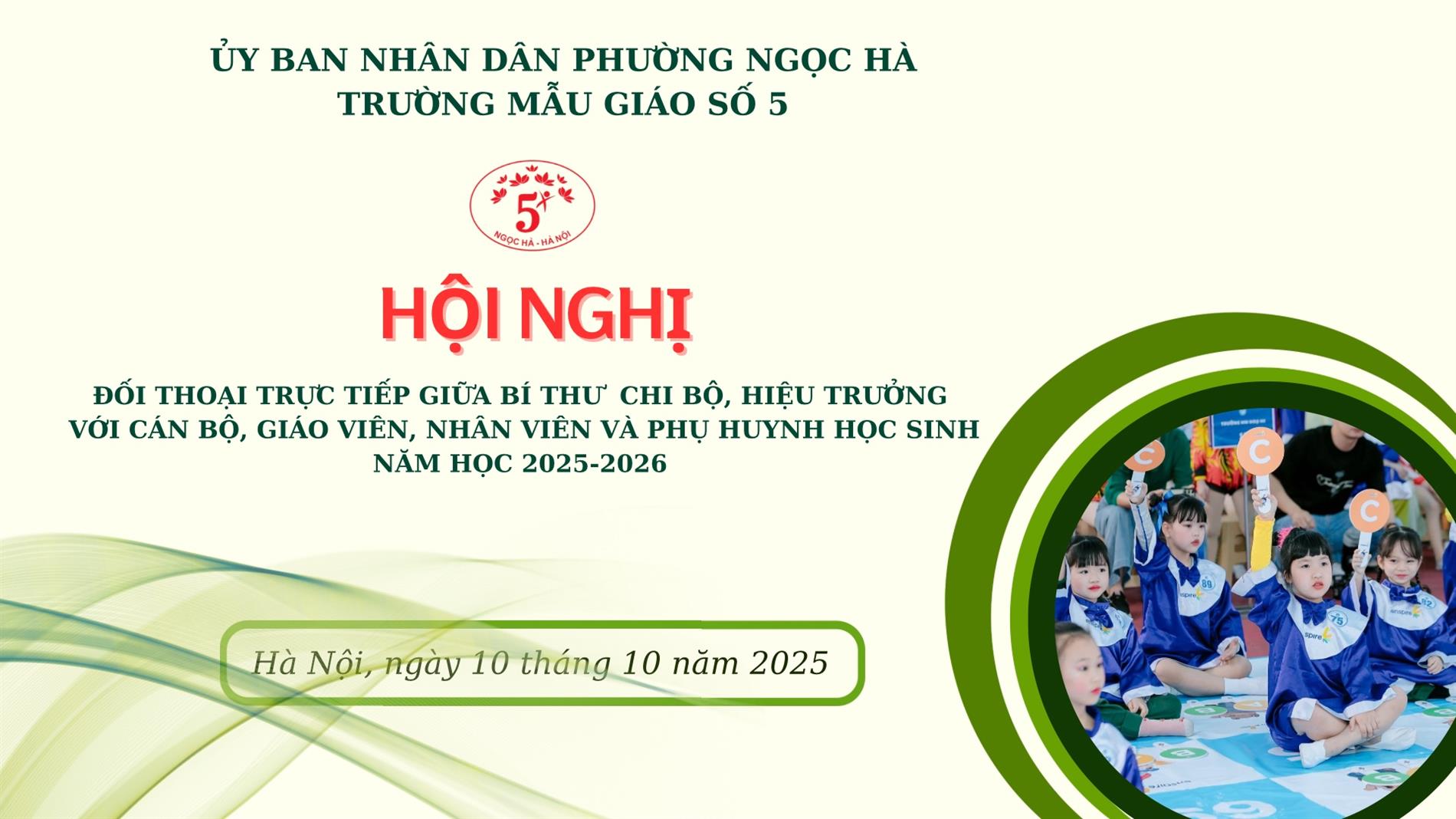 Chiều ngày 10 tháng 10 năm 2025 trường Mẫu giáo Số 5 đã tổ chức Hội nghị tiếp xúc, đối thoại trực tiếp giữa Bí thư chi bộ, Hiệu trưởng nhà trường với CBGVNV và phụ huynh học sinh trong việc đảm bảo cá...
