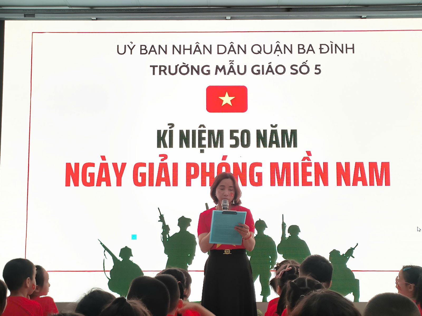 Sau giờ chào cờ đầu tuần, Nhà giáo Nguyễn Thanh Hằng - Hiệu trưởng nhà trường có những chia sẻ gần gũi về ý nghĩa lịch sử của ngày 30/4. Tiếp theo đó, các bé được xem những thước phim tư liệu quý giá, tái hiện lại những hình ảnh về đất nước Việt Nam trước ngày 30/4, diễn biến chiến dịch Hồ Chí Minh lịch sử, khoảnh khắc lá cờ giải phóng tung bay trên nóc Dinh Độc Lập và hình ảnh Việt Nam tươi đẹp ngày nay.