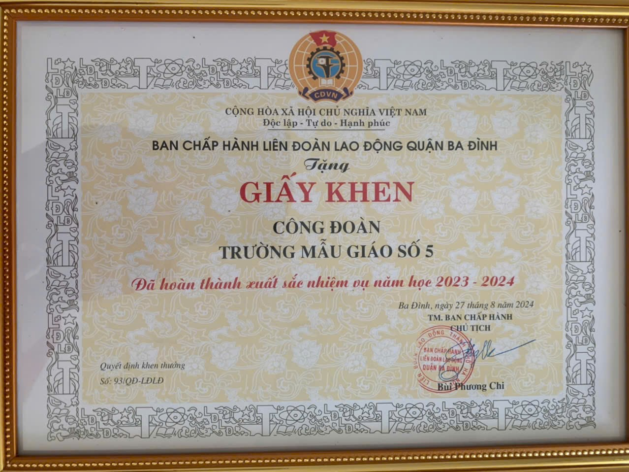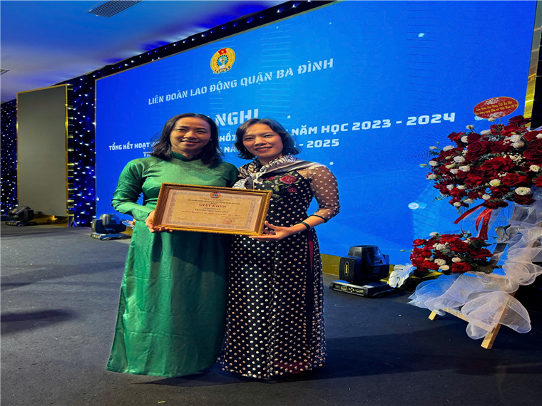 Công đoàn trường Mẫu giáo Số 5, với những thành tích nổi bật, vinh dự được Ban Chấp hành Liên đoàn Lao động quận Ba Đình tặng Giấy khen hoàn thành Xuất sắc nhiệm vụ năm học 2023-2024.