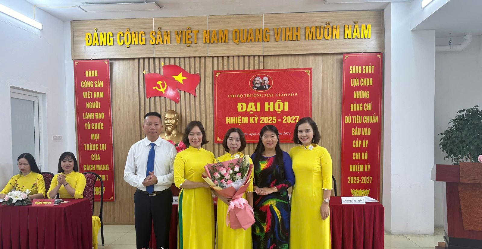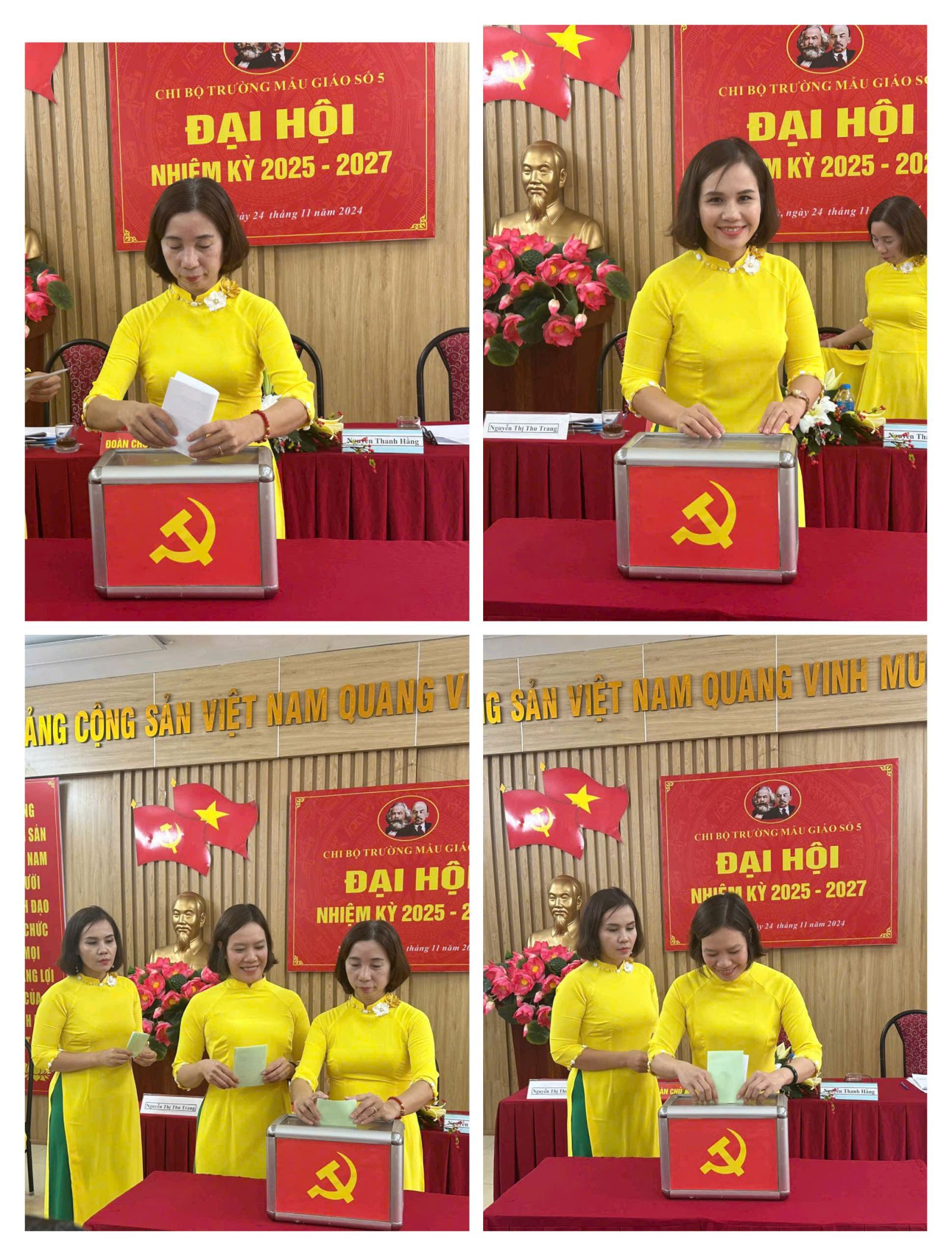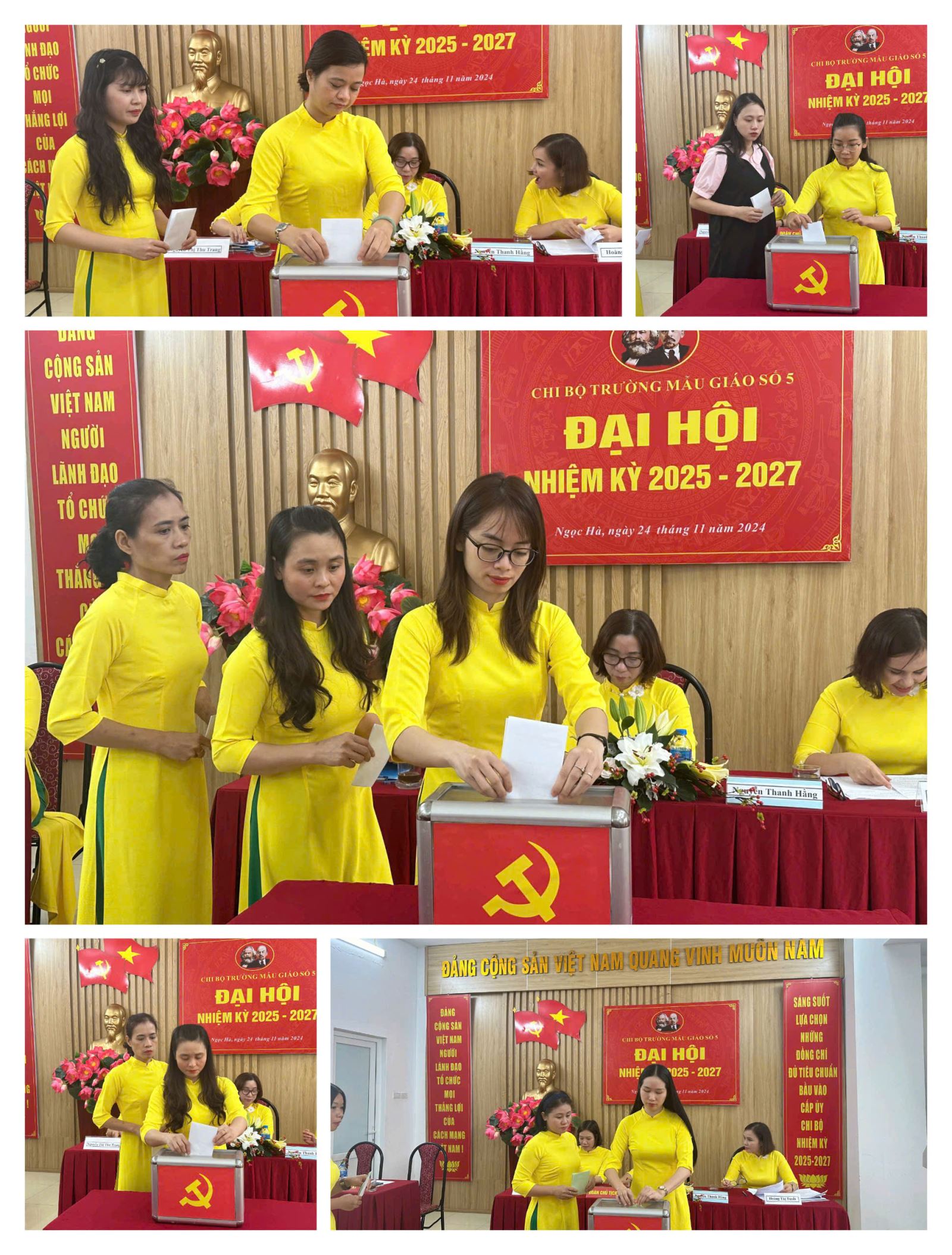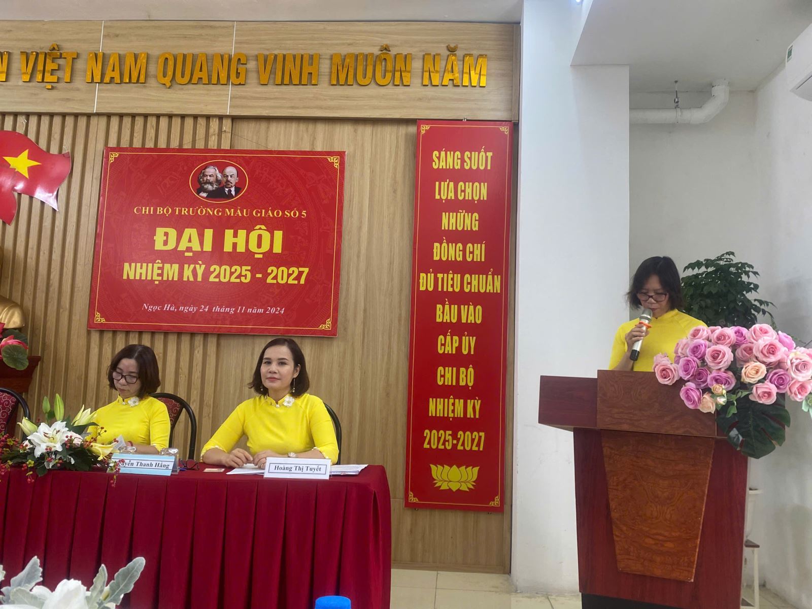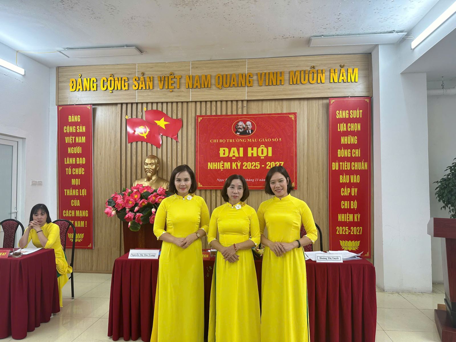 Đại hội đã bầu ra 3 đồng chí vào Ban chi ủy khóa mới; Các đồng chí trong cấp ủy chi bộ Mẫu giáo Số 5 nhiệm kỳ 2025-2027 lên ra mắt Đại hội: