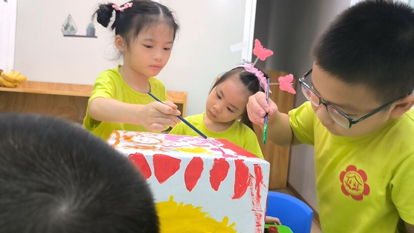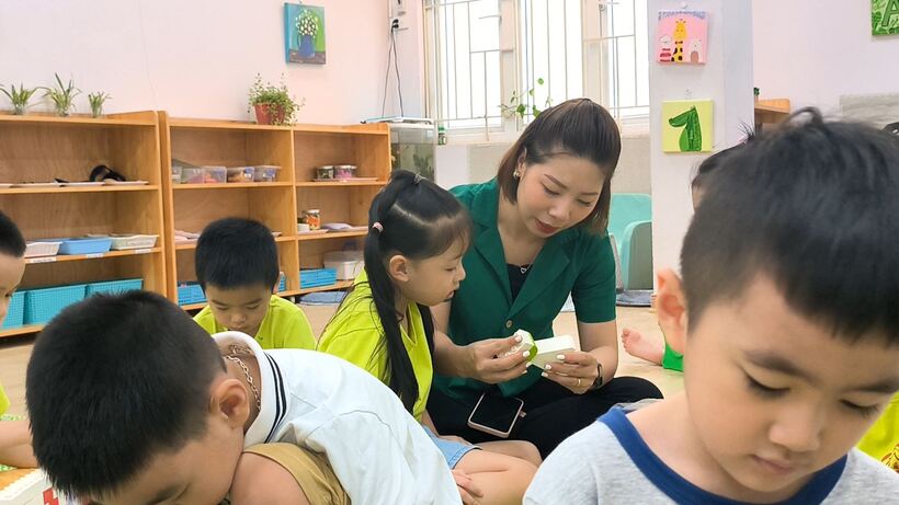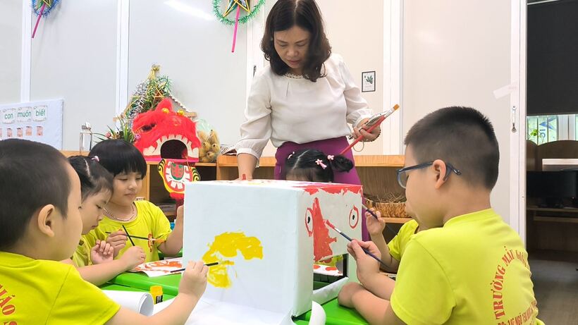 Cô Trần Thị Hồng Loan, Phó Hiệu trưởng nhà trường cùng các con trang trí đầu lân