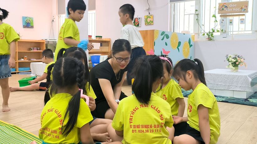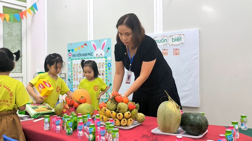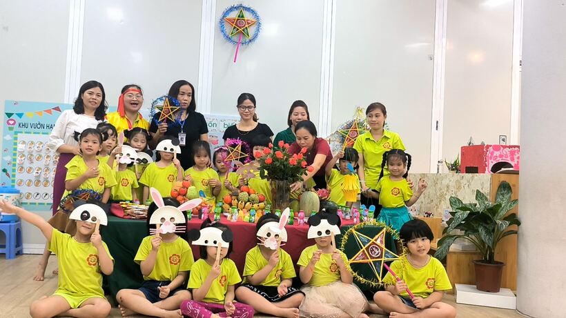 Cô Nguyễn Huỳnh Thu Cúc, Hiệu trưởng nhà trường, cùng các con bày mâm cỗ trung thu