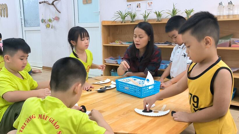 Các vị phụ huynh cùng làm mặt nạ và lồng đèn với các con