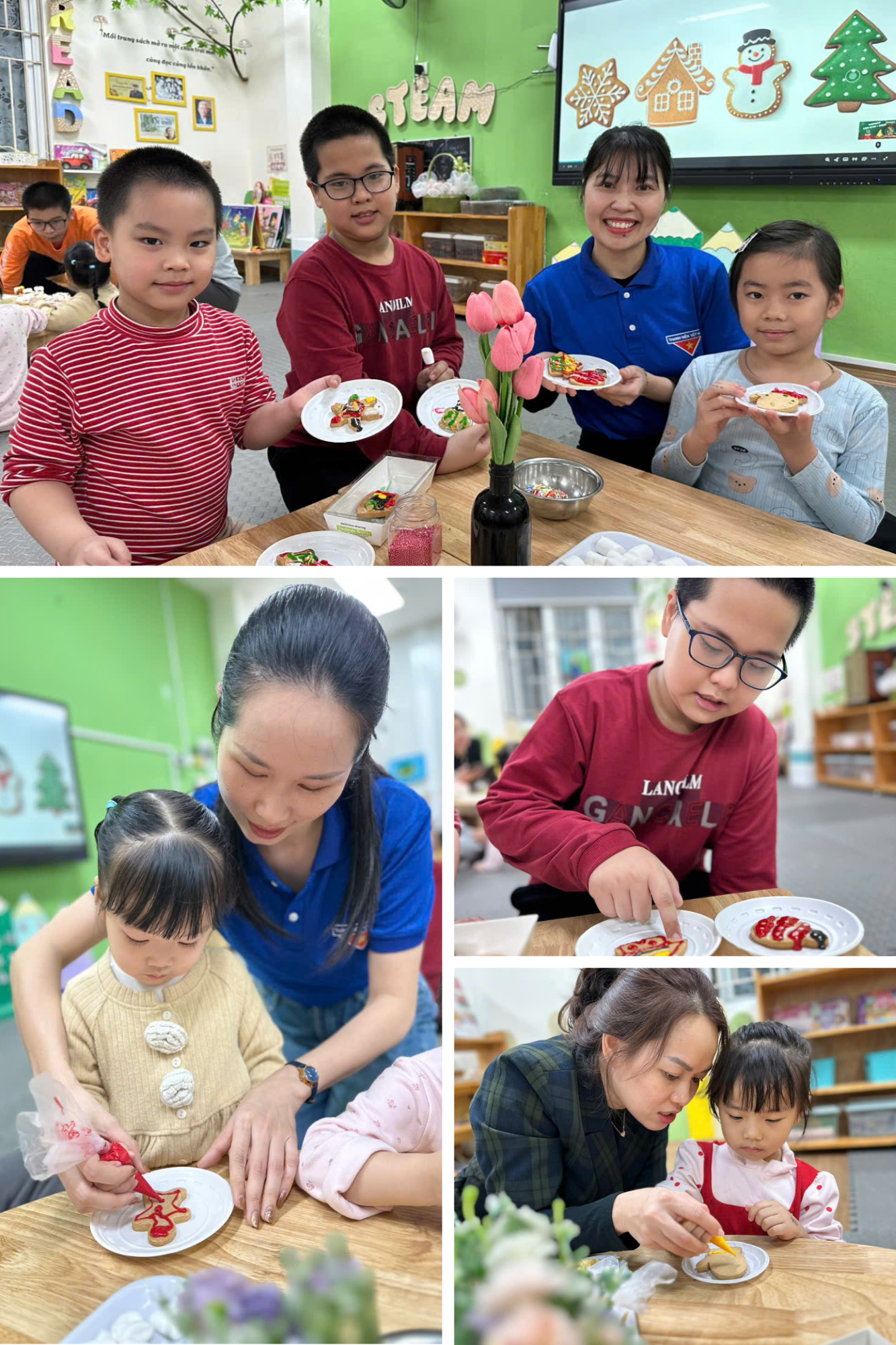 Dưới sự hướng dẫn tận tình của các đoàn viên thanh niên, các bé đã hóa thân thành những "nghệ nhân nhí", tự tay trang trí những chiếc bánh gừng mang hình dáng bông tuyết, chú tuần lộc hay ngôi nhà nhỏ xinh xắn. Mỗi chiếc bánh không chỉ là sản phẩm của sự khéo léo mà còn gửi gắm những ước mơ ngây ngô, trong sáng của các con về một mùa Giáng sinh nhiệm màu.