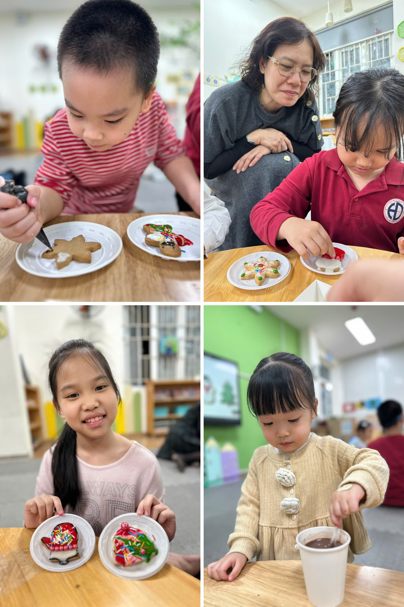 Bên cạnh trải nghiệm làm bánh, các bé còn được tự tay pha chế cho mình những ly cacao nóng hổi, phủ thêm lớp kẹo dẻo marshmallow ngọt ngào. Tiếng cười đùa rộn rã hòa cùng tiếng nhạc Giáng sinh du dương đã tạo nên một bức tranh cuối năm thật trọn vẹn.