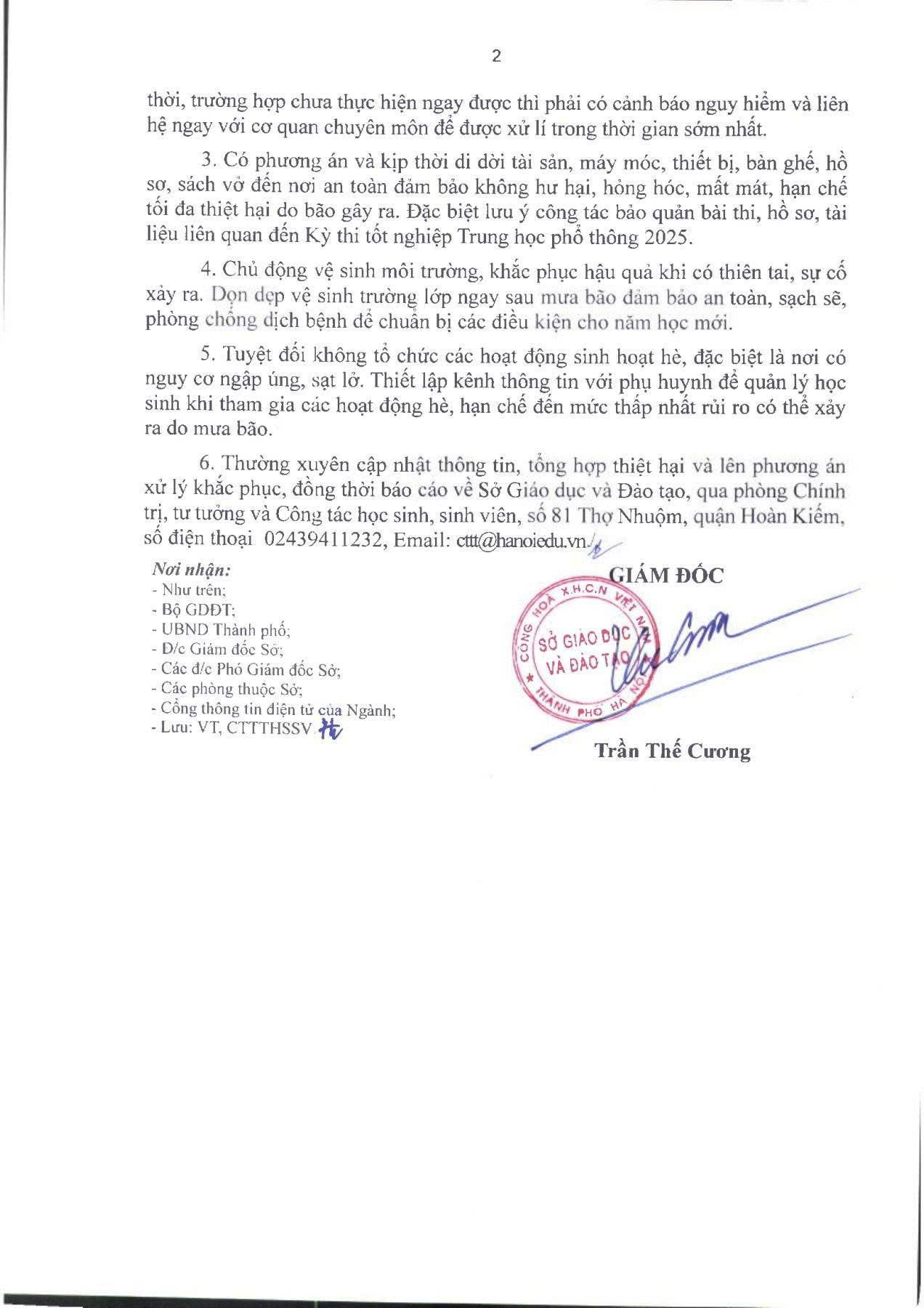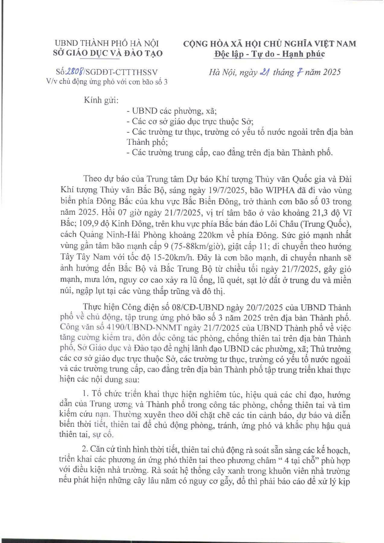 Thực hiện chỉ đạo theo công văn số 2808/SGDĐT-CTTTHSSV của UBND Thành phố Hà Nội và Sở GD và ĐT Hà Nội, về việc chủ động ứng phó với cơn bão số 3.