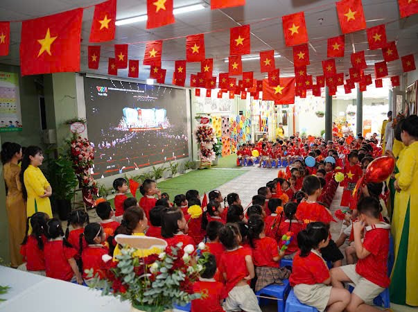 Cán bộ, giáo viên, nhân viên và học sinh trường Mẫu giáo Số 5 dự Lễ Khai giảng trực tuyến.