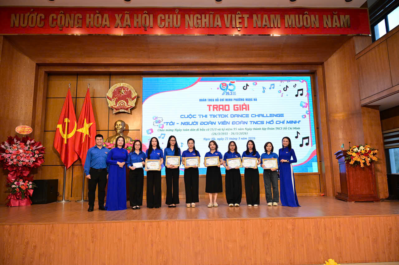 Bên cạnh các nội dung chính luận, không khí buổi lễ trở nên bùng nổ với phần công bố kết quả các cuộc thi sôi động. Với sự sáng tạo, năng động và tinh thần đoàn kết, Chi đoàn nhà trường đã phối hợp Chi đoàn khu dân cư 1, 3 xuất sắc vượt qua nhiều đội thi để giành giải Ba cuộc thi TikTok Dance Challenge năm 2026. Tiết mục của Chi đoàn đã để lại ấn tượng mạnh mẽ về hình ảnh người giáo viên mầm non hiện đại: "Giỏi chuyên môn, giỏi cả phong trào".
