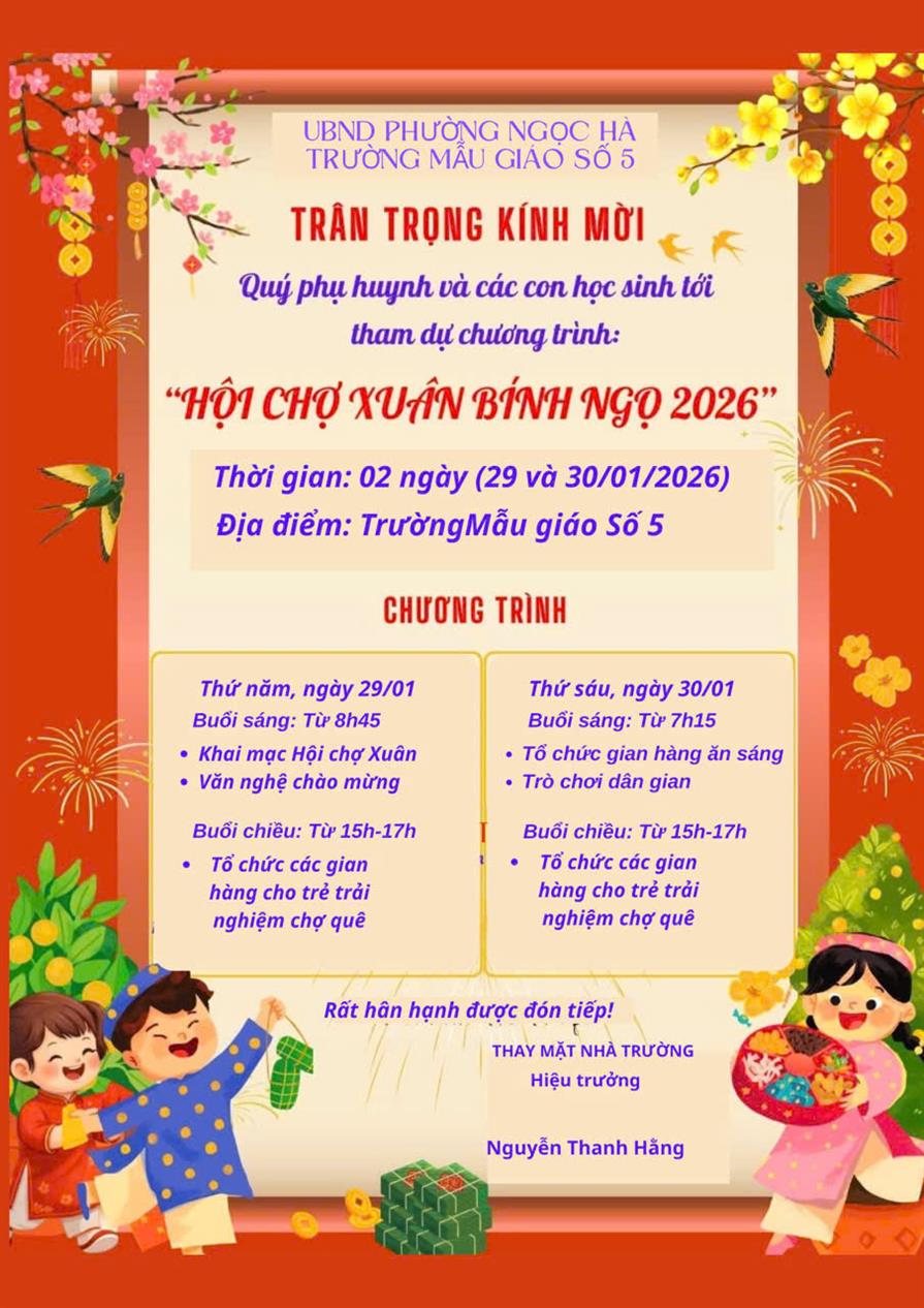 Trường Mẫu giáo Số 5 trân trọng thông báo và kính mời Quý phụ huynh học sinh tới tham dự chương trình Hội chợ Xuân Bính Ngọ năm 2026. Trân trọng!