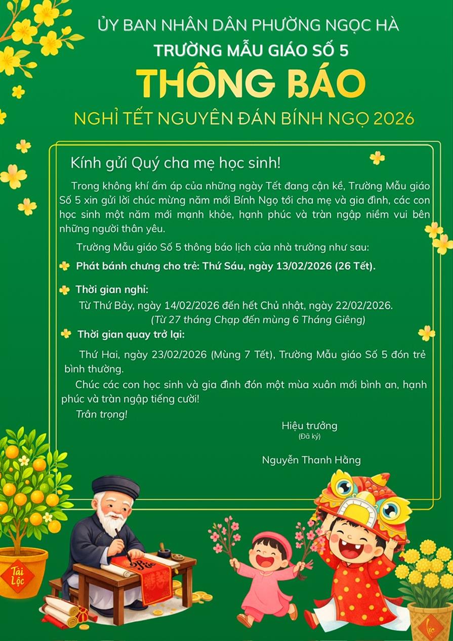 Trường Mẫu giáo Số 5 Trân trọng thông báo tới CBGVNV và phụ huynh học sinh lịch nghỉ Tết Nguyên đán Bính Ngọ 2026.
