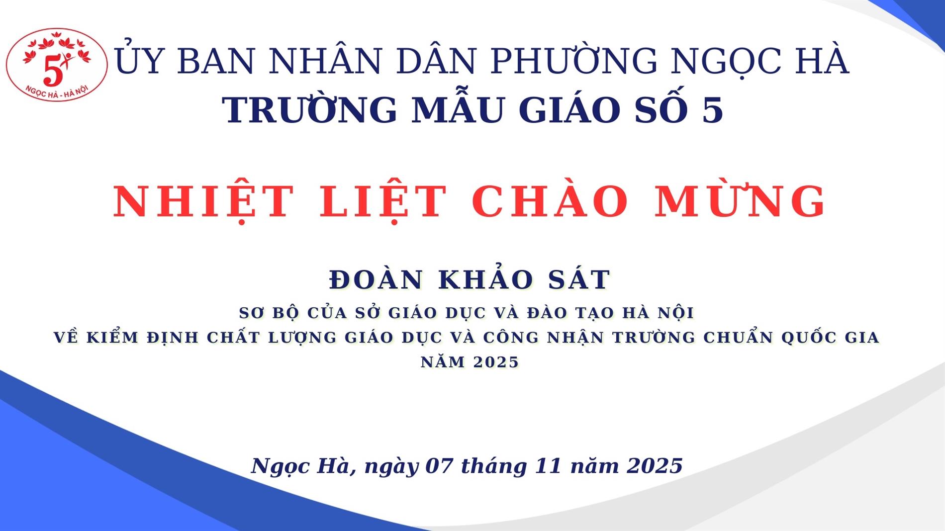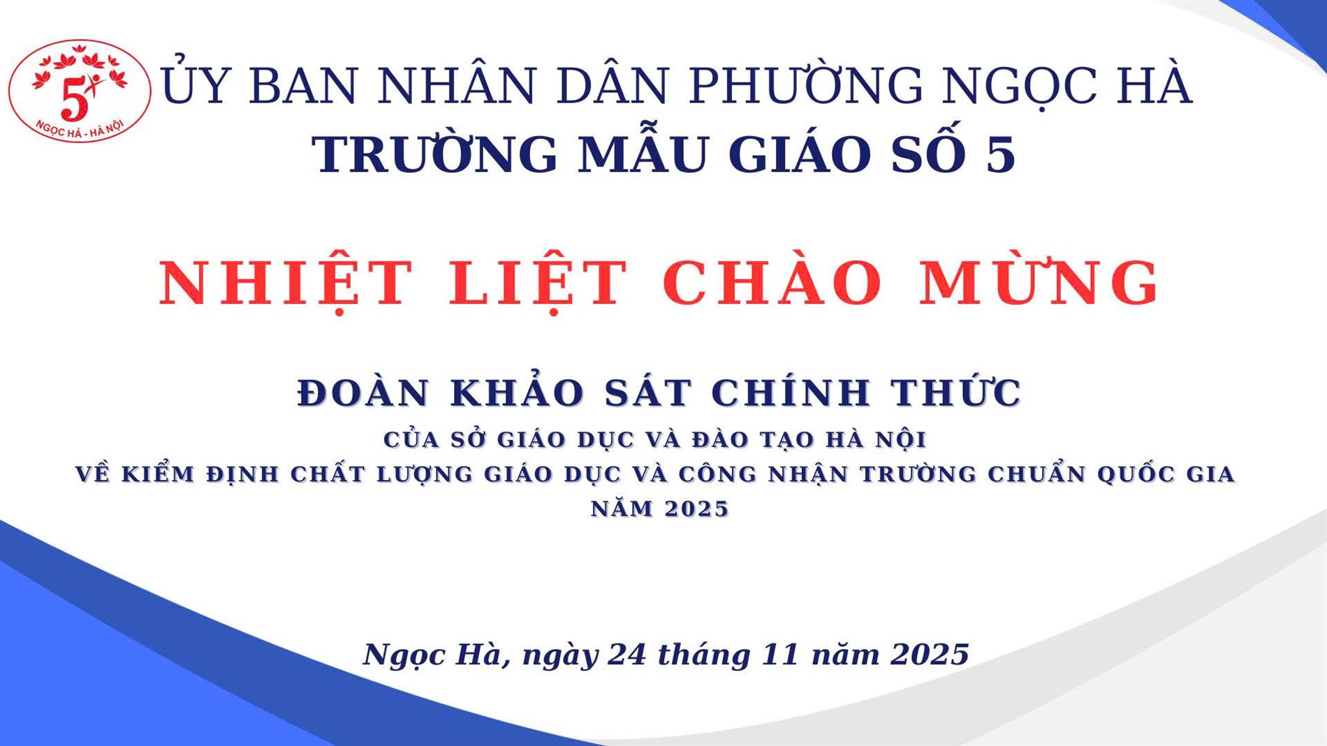 Sáng 24/11/2025, Trường Mẫu giáo Số 5 vinh dự đón. Đoàn khảo sát chính thức của Sở Giáo dục và Đào tạo Hà Nội về làm việc, thực hiện công tác Kiểm định chất lượng giáo dục (KĐCLGD) Cấp độ 2 và Đánh g...