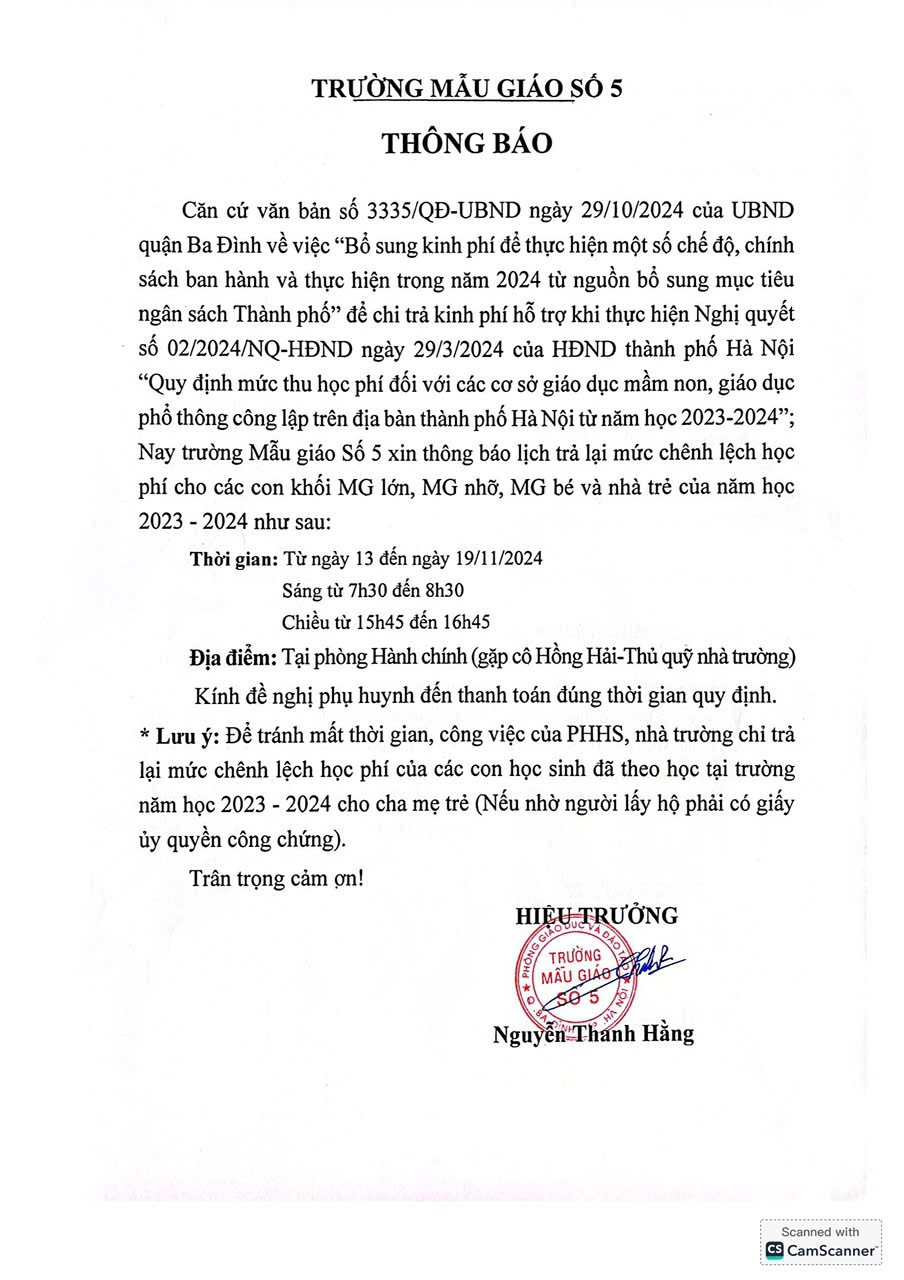 Trường Mẫu giáo Số 5 trân trọng thông báo tới quý cha mẹ học sinh về lịch trả lại mức chênh lệch học phí của trẻ năm học 2023-2024.