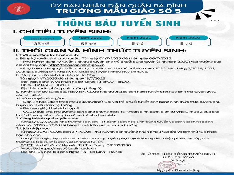 Trường Mẫu giáo Số 5 trân trọng thông báo tới quý phụ huynh học sinh về chỉ tiêu, thời gian và hình thức tuyển sinh năm học 2025-2026.