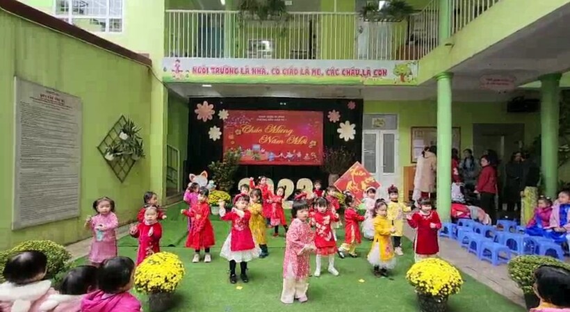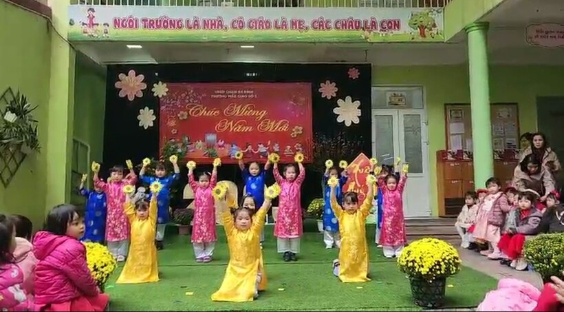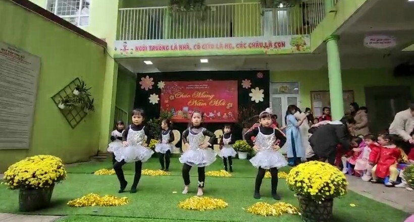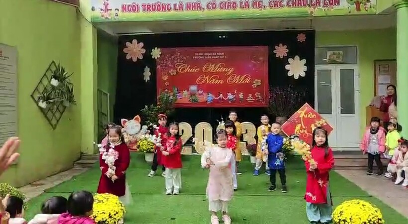 Tiết mục Bé đón Tết sang do các em bé khối Mẫu giáo bé biểu diễn.